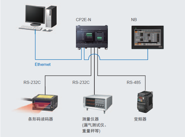 使用CP2E的Ethernet连接多台装置模块,可灵活提供与终端用户相匹配的较佳装置规模,有助于设计的效率化和提高生产效率。