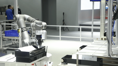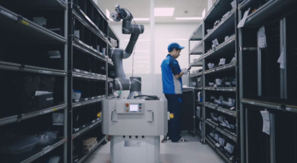 整合了移动机器人和协作机器人的“移动操纵机器人(MoMA)” 使部品架与作业工序之间的部品搬运完全实现自动化,