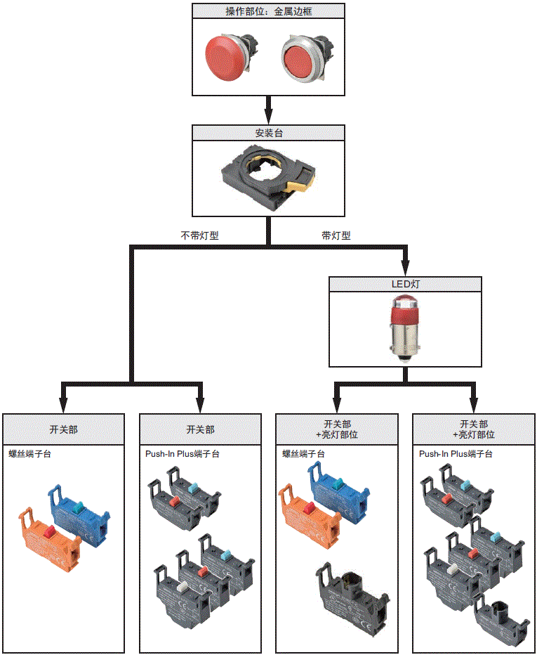 操作部位、LED灯(仅限带灯型)、安装台、开关部、亮灯部位(仅限带灯型)请单独订购。LED灯、安装台、开关部、亮灯部位、止转片与A22N系列通用。