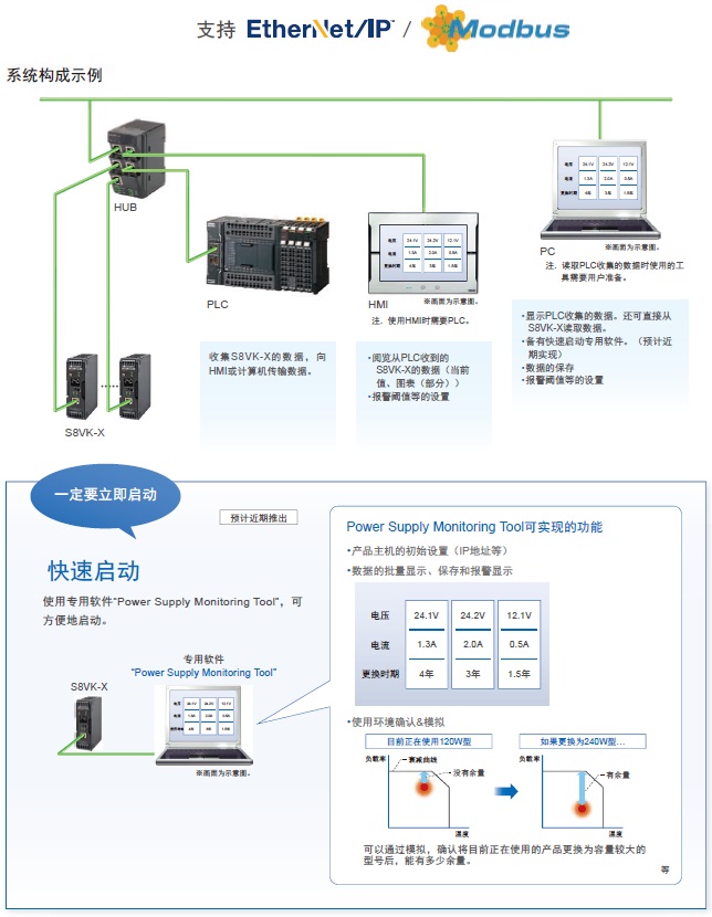 S8VK-X可根据部件温度计算内部搭载的电解电容器的老化情况,通过通信和显示告知。