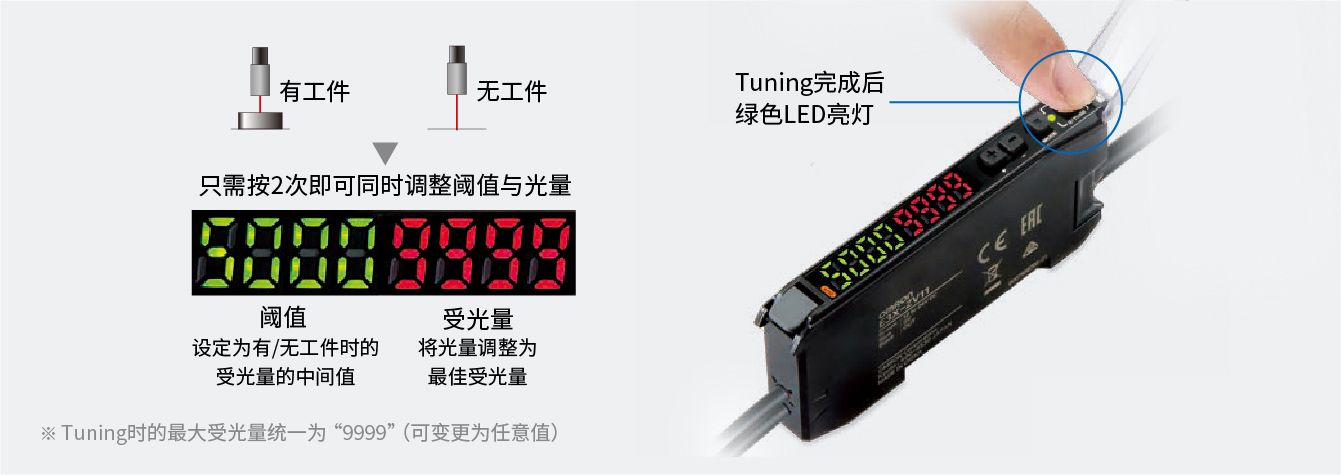 放大器E3X-ZV只需在有工件和无工件时各按1次按钮,即可快速将光量和阈值同时调整至理想条件,操作通用且不受检测物体和安装条件影响,确保位置识别的准确性。