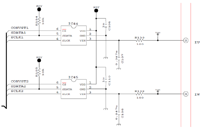 (2)由于输出端负载冲击,出现瞬间电流尖峰,使得控制基板上电流采样回路A/D 转换器IC44,IC45 损坏,电流采样转换值过大,导致CPU 认为过电流而报警。