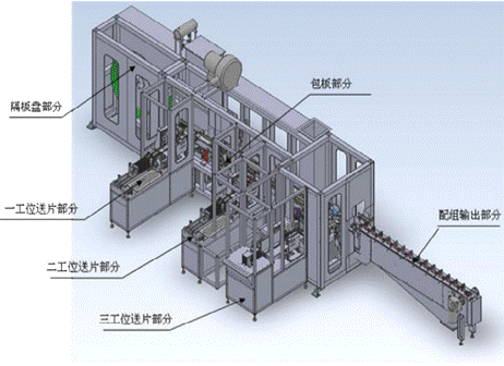 二次电池包封配组机如图1所示,设备主要由六大部分构成,分别是隔板盘部分、一工位送片部分、包板部分、二工位送片部分、三工位送片部分和配组输出。