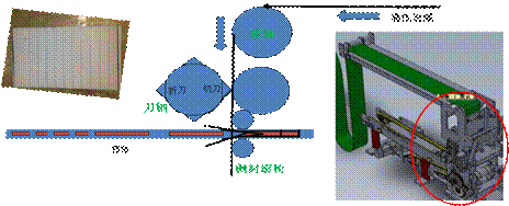 3. 包板部分:对一工位送来的极板进行包封。具体操作过程是:ACM膜通过隔板输送电机送到模轴,刀轴对送来的膜进行切割和折中线动作,极板输送轴把极板送入切割完后的膜进行两边的侧封。如图3所示。
