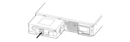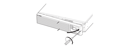 1.用螺丝刀逆时针旋转不间断电源(UPS)前面板右侧的两个螺丝,松动。(构造上螺丝不会从前面板脱落。)