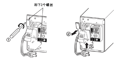 将前面板下侧的钩爪部分插入本体的凹槽部分, (2)、向本体方向推入。(3) 请用螺丝刀将拆下的2个螺丝按照顺时针方向拧紧。此时,请注意用金属护罩夹住电缆。