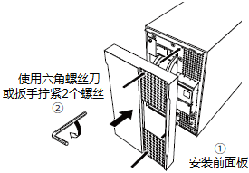 8.使用六角螺丝刀或扳手顺时针旋转分别在前面板中央部上下的2个螺丝,拧紧螺丝②。