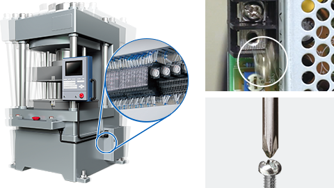不会因振动脱落,无需加强拧紧Push-In Plus端子台通过弹簧结构固定端子 / 电线,不会因振动导致螺钉松动或脱落,所以无需反复确认以避免螺钉松动导致异物混入或者忘记拧紧螺钉。